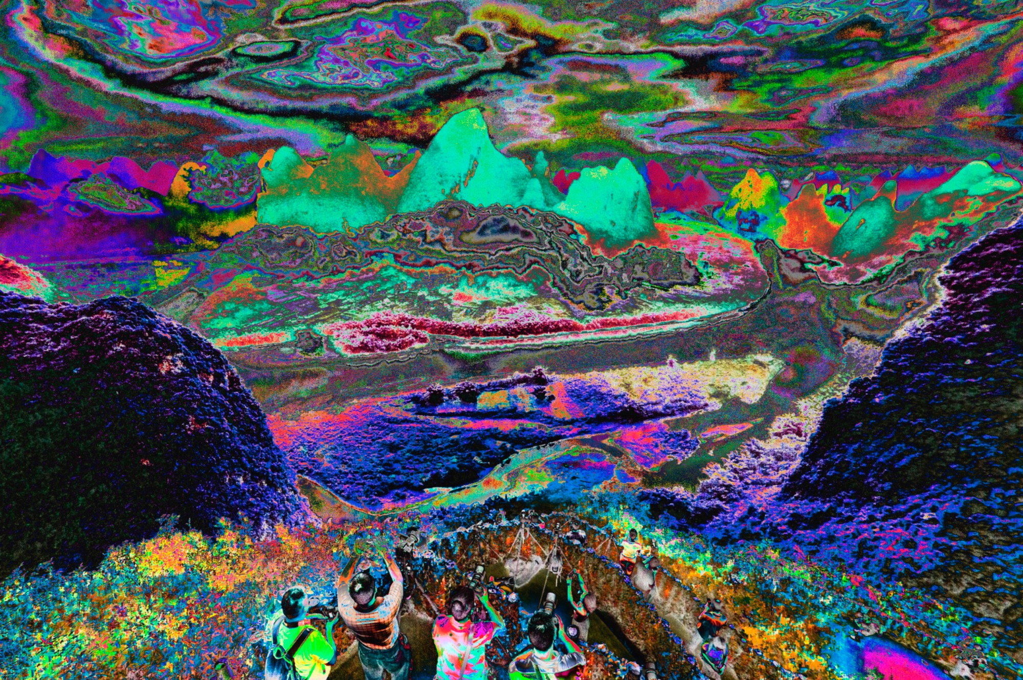 然後我們看到官宏滔利用數碼後製過程創作的「面目全非」的「山水」圖像,其藝術「意象」;寓「意」之「象」,是藝術家審美理想和審美意藴追求的體現,是主觀與客觀的統一,是用來寄託主觀意識的客觀物象。他的「非」觀,是一種後現代的主觀反叛,而非虛無主義中的否定客觀存在的所有可能性。加上其具有虛擬性的特徵,指意象所具有的非現實性。意象既可以用想象和虛構來表現現實中沒有的東西,也可以用非現實的形態表現現實中已有的東西。官宏滔的虛擬「山水」攝影,並非虛構,而是基於其數碼本質的延伸。他說:「我們習慣的顏色只是人眼和大腦處理出來的,而現實可以有無限種可能性。而數碼攝影的本質就是數據捕捉。」