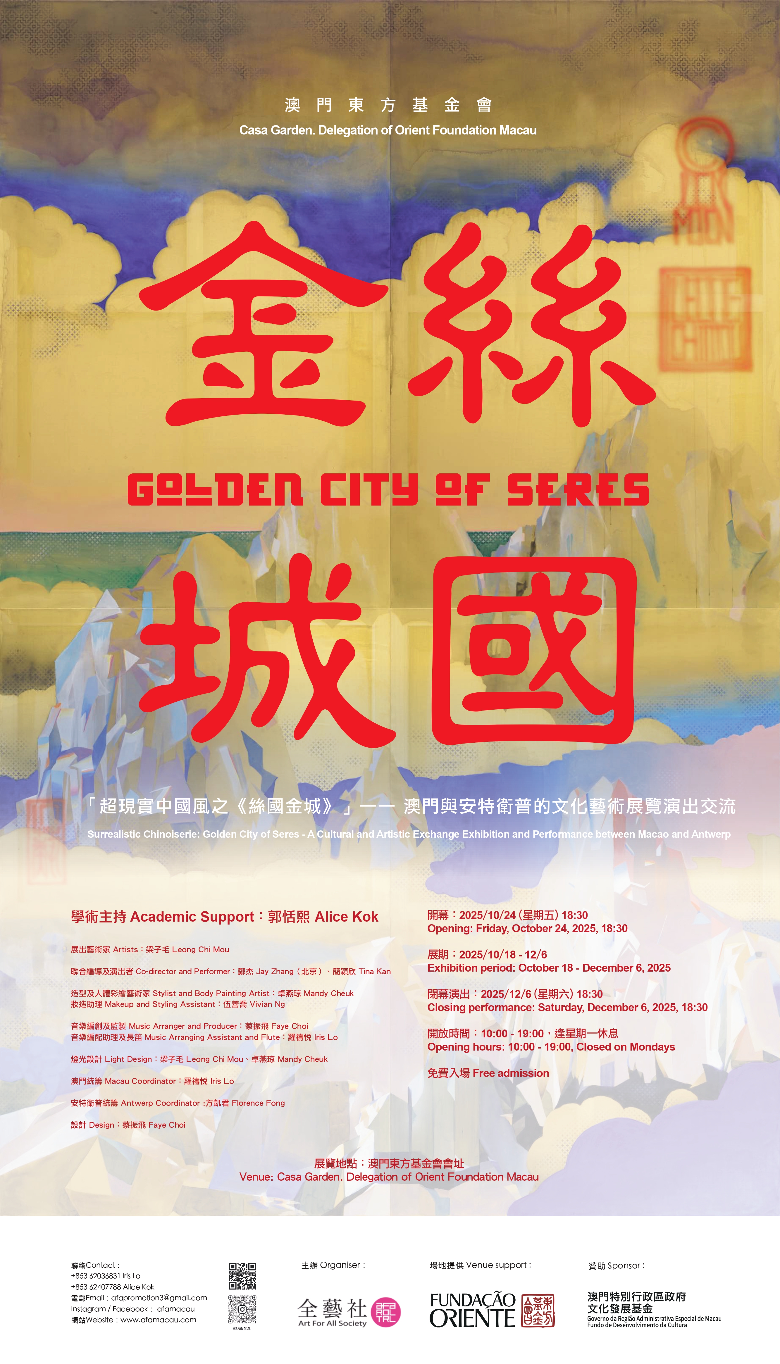 是次「全藝社秋季沙龍2025」之藝術盛事由全藝社主辦、東方基金會合辦;「超現實中國風之《絲國金城》」由全藝社主辦,兩展均獲東方基金會場地支持,並由澳門文化發展基金資助。歡迎各界人士前來參觀欣賞。如有垂詢,請與本社陳小姐聯絡,電話:(853)6357 3404或電郵至:afapromotion3@gmail.com