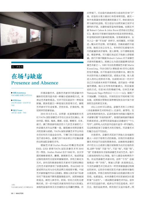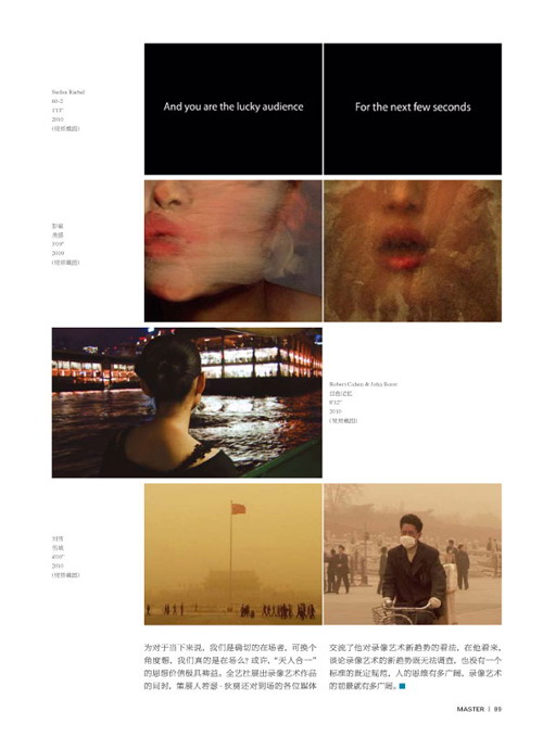 德國藝術家Stefan Riebel的概念性動畫《60》、《25》獲得VAFA國際錄影藝術節2010的一等獎。Stefan Riebel生於1982年,在大學期間曾修讀美術、雕塑、新媒體藝術,他試圖通過探究語言的元層面來掌握語言,並將之轉化為藝術。多科目的修讀使得藝術家對於怎樣詮釋自己的藝術語言遊有了多重選擇性。作品《60》即是試圖在認同與分化的邊界之間取得平衡。中國藝術家彭韞的作品《質感》,描繪人體在某個私密空間下做連續不斷的重複舔舐動作,試圖突破固有觀念,闡明人體存在、時間、空間之間的無邏輯關係。另一位元中國藝術家劉偉的作品《傷城》,表現的是每年春天北京城刮沙塵風暴的情景,在此情境下,無論是代表權力意志的天安門廣場,還是在大街上騎自行車的尋常百姓,都無一另外的籠罩在昏黃色調的陰影之下,借此探究自然與城市化進程、權力意志與自然災害之間不可調和的矛盾,主題傷城更是有所隱喻。法國藝術家Robert Cahen & John Borst的作品《紅色記憶》,重點在於探索時間結構對現實世界的視覺、聽覺和時間相互影響的規律。在視頻畫面中,女主人公一副“不在場”的樣子,時而凝固、時而躍進;鏡頭時而定格、時而激進,仿佛流逝的不是時間,她站立在公車上,車外的燈紅酒綠與車內的寂寞形成矛盾體,使人錯愕,分不輕哪是現實、哪是夢境。而主題紅色記憶不免使人浮想聯翩。我們不得不佩服Robert Cahen對於錄影藝術語言的敏感力,其被公認為是法國最著名的錄影藝術家之一。1981年出生的德國藝術家Marte Kiessling,作品《獨白》描繪是80後內心孤獨的生存境遇。在不知通往何處的路中央,著紅色外衣的年輕人或掩面沉思、或低頭不語,使人想進入其內心世界而不得,也說明80後一代對於自己方向或者未來的不明確感,進而途生一種落寞的情感。她以女性特有的敏感力,用反復敍說的方式,引發80後的情感共鳴。日本藝術家Tomoyuki Yago的作品《一二三-五》,展現了不同國籍、不同膚色、不同性別在不同環境下的坐姿,試圖探討事物在某種情況和生命中某個時刻的互動和相互關係。