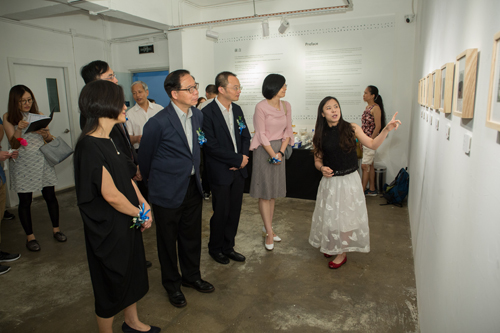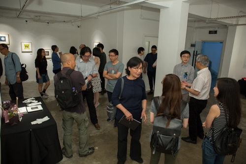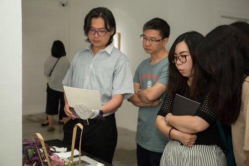 嘉賓專注地聆聽參展藝術家兔子(右)的講解