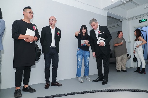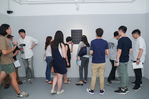 嘉賓欣賞著參展藝術家黃詠瑤的作品