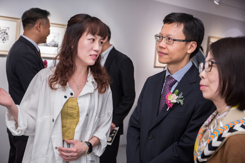 嘉賓欣賞著參展藝術家鄭慧蘭的作品